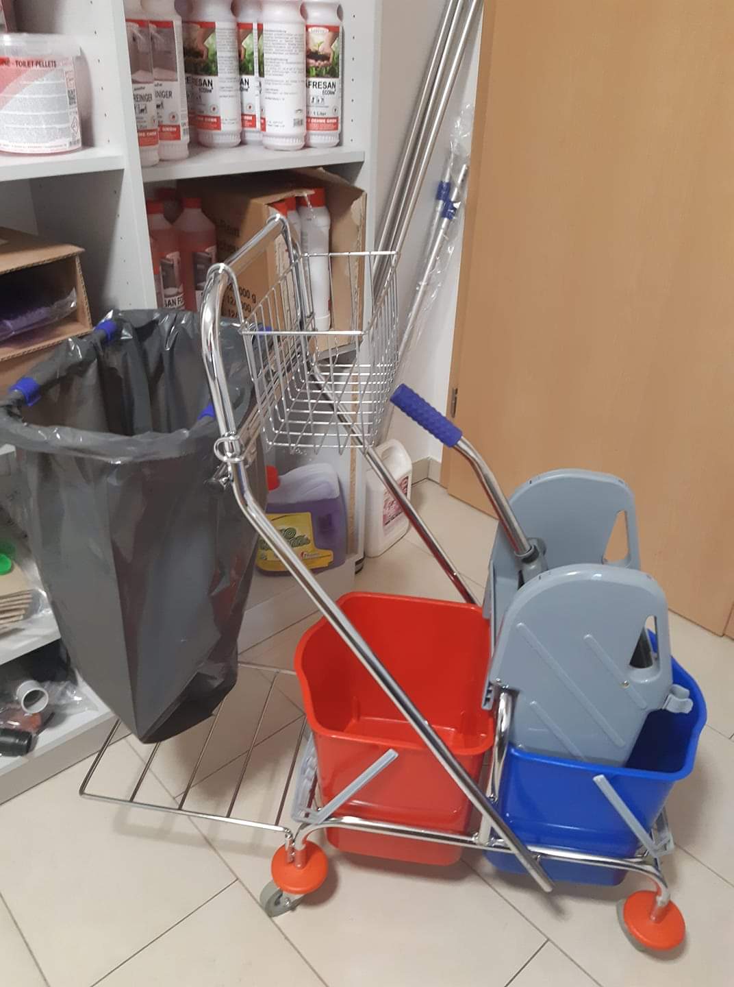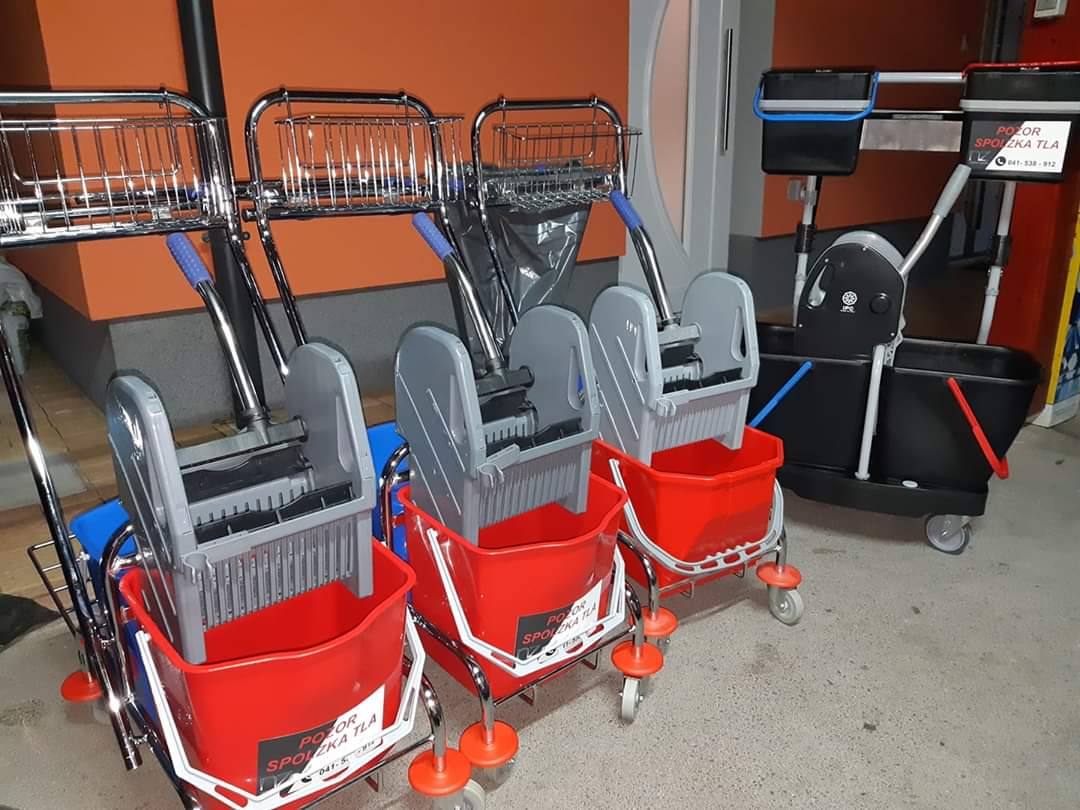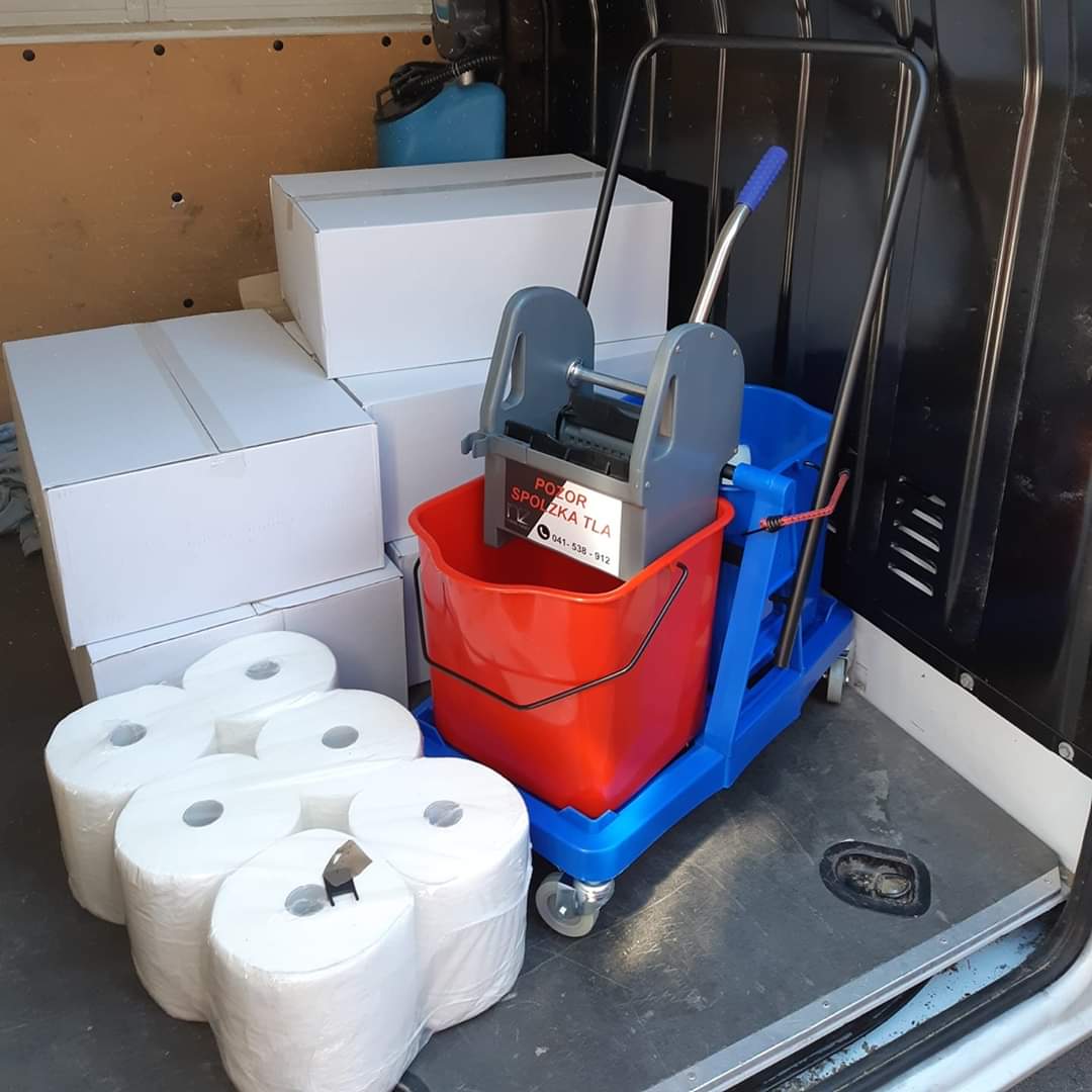 pripomočki za čiščenje (brisala za tla, čistilni vozički, krpe, vrečke za smeti...)